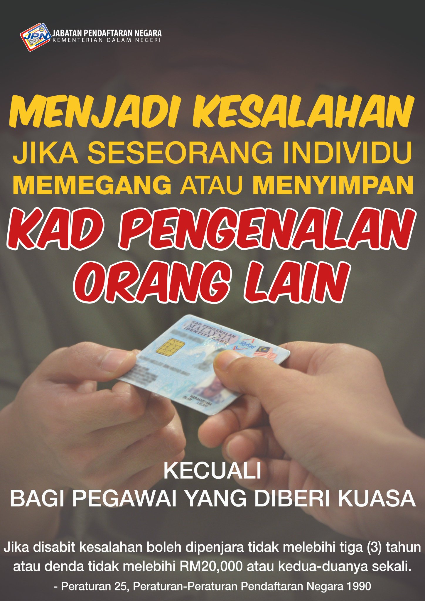 Kumpulan Yang Dibenarkan Memegang Atau Menyimpan Kad Pengenalan Orang Awam : Silahkan klik link diatas untuk melihat tentang kumpulan wa janda mencari suami terlengkap!!. Cetak kad pengenalan baru anda pada stok kad tebal. Menurut jpn, memegang atau menyimpan kad pengenalan orang lain adalah menjadi satu kesalahan, kecuali bagi pegawai yang diberi kuasa sekiranya anda mempunyai maklumat mengenai berita tidak ditentusah yang melibatkan kepentingan awam mahupun negara, salurkan kepada kami. Berbeza dengan dokumen lain, tugas dokumen pengenalan ini adalah cuma untuk menyatakan identiti pembawanya. Di bawah permohanan untuk memegang jawatan dalam parti politik bagi kumpulan sokongan.2 catatan: Keputusan dibuat oleh ketua pengarah perkhidmatan awam bagi pegawai gunasama dan.