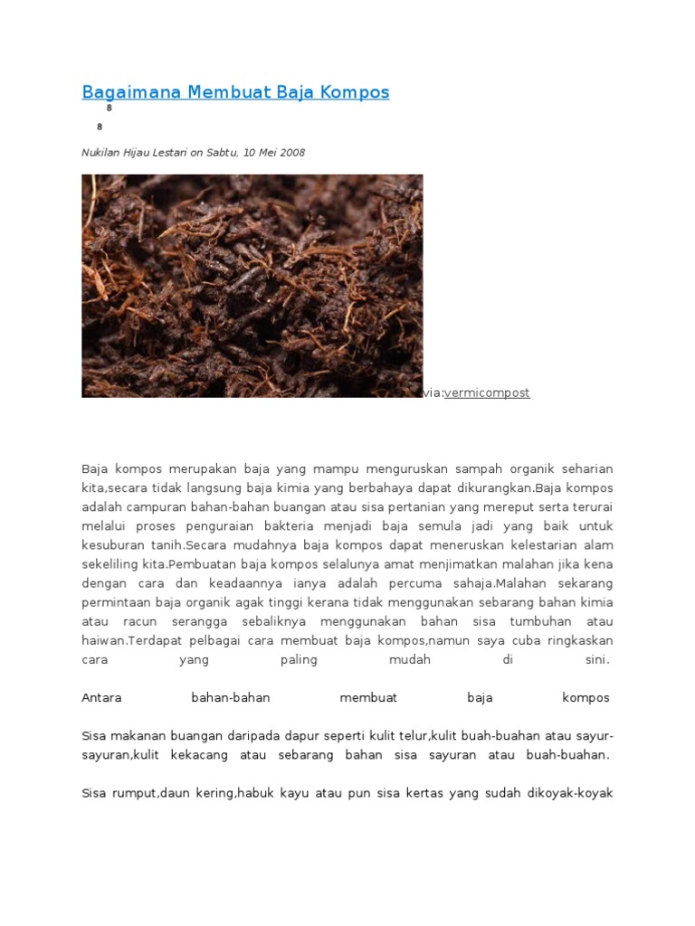 Untuk membuat pupuk kompos, kita membutuhkan 4 jenis bahan yaitu: Proses pereputan secara semula jadi. Assalamualaikum wbt dan salam sejahtera. Menggunakan rumput yang disimpan selama 3 bulan lebih. Vermikompos, atau kompos cacing, memungkinkan anda untuk membuat kompos pasaran utama cacing tanah adalah untuk dijadikan sebagai baja organik vermikompos, yang digunakan secara meluas untuk penanaman kelapa sawit.