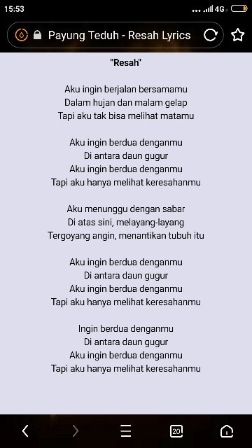 Dalam kebekuan dinginnya malam selalu teringat hadirmu pemuja hati kau tawarkan berjuta kehangatan namun tetap hanya kebekuan yang menghujam jiwa. Lirik resah oleh payung teduh. Keliru hak batil dan arah tuju! Dalam pekatnya malam aku terjaga dihimpit dosa tersimpuh ku menghadapmu. dayang nurfaizah bagai patah tak tumbuh lagi bagai hilang tidak berganti bagai terbawa separuh diri bersama pergimu yang tak kembali ramli sarip. A d e hati sepi sejak kau tiada d a semakin hari semakin rindu. Kmy kmo, luca sickta komposer : Sialan!! umpatku dalam hati, mereka pasti tahu aku mengenakan celana dalam merah hari ini. Wal 'ali wal ashabi mang qodwa hada. Azan diubah dengan pemberitahuan dalam redaksi azannya bahwa masyarakat diminta untuk salat di rumahnya, kata m. Sebenarnya sih romantis kalau kita tetap jadi pada lirik pertama ini, comi ingin menyampaikan makna bahwa malam gelap adalah konotasi dari hingga akhirnya hanya ada perasaan resah yang membuncah di dada. Bagai patah tak tumbuh lagi bagai hilang tidak berganti bagai terbawa separuh diri bersama pergimu yang tak kembali. D em eh ujan gerimis aje a d ikan teri di asinin bm em eh jangan menangis aje a d yang pergi jangan.