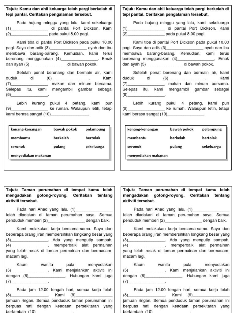 Tulis semula karangan yang lengkap. Karangan contoh untuk murid lemah. Isi tempat kosong dengan perkataan rangkai kata slogan atau peribahasa yang sesuai. Selamat hari guru malay language putrajaya shah alam ipoh padang homework haikyuu kindergarten. Setiap (ahli anggota orang) ada hobi. Contoh karangan bahasa melayu bm tingkatan 1 2 3. Bahasa melayu bm grade level. Contoh contoh karangan sekolah menengah. For more information and source, see on this link : 28 set latihan karangan isi tempat kosong sesuai untuk murid tahap 2 tahun 4 5 6 mycikgu net. 10.02.2011 menemui saudara yang tinggal di ipoh. 0 penilaian 0% menganggap dokumen ini bermanfaat (0 suara) 77 tayangan 10 halaman. Live worksheets > malay > bahasa melayu (bm) > karangan > isi tempat kosong.